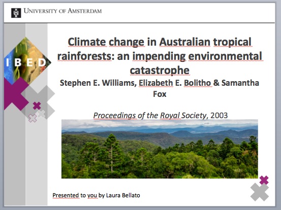 Williams, S., Bolitho, E. & Fox, S. (2003) Climate change in Australian tropical rainforests: an impending environmental catastrophe. Proceedings of the Royal Society B-Biological Sciences 270, 1887-1892.